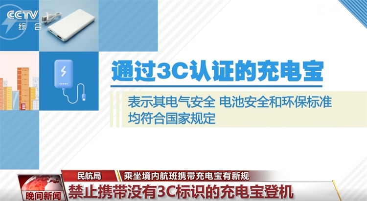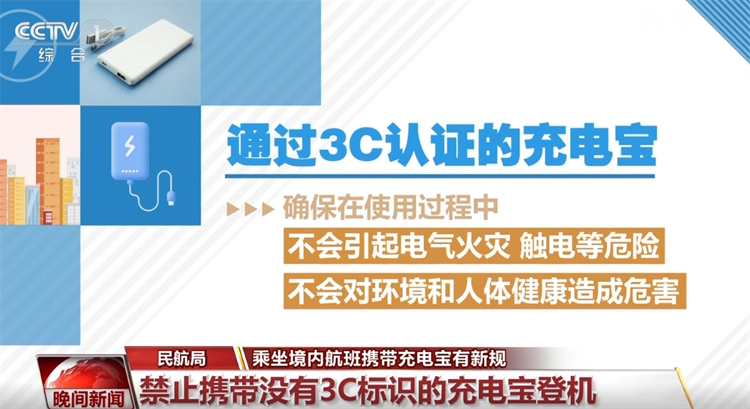 央视网消息:记者6月26日从民航局了解到,自6月28日起,禁止旅客携带没有3C标识、3C标识不清晰、被召回型号或批次的充电宝乘坐境内航班。那么点点赢,什么叫有3C标识的充电宝?又为何要出台更加严格的管控措施呢?