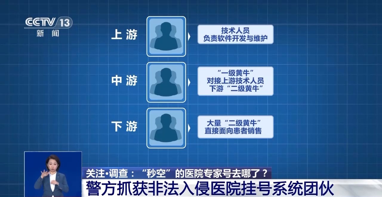 在警方抓获的三个犯罪团伙中,虽然抢号使用的技术手段不尽相同,但三个团伙都是由上游负责软件开发与维护,中游也就是“一级黄牛”,下游则是大量“二级黄牛”直接面向患者销售,形成环环相扣的黑色产业链。