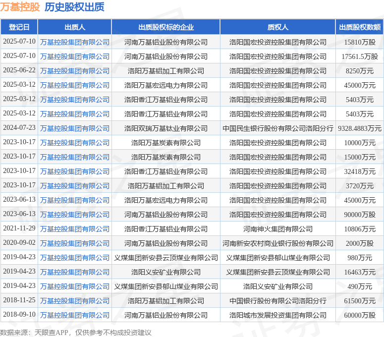 本站消息,根据天眼查APP显示,在7月10日登记的一则股权出质信息(登记编号:410323202500000036)中牛达人,万基控股集团有限公司出质其所持有的河南万基铝业股份有限公司股权,出质股权数额为15810万股牛达人牛达人,质权人为洛阳国宏投资控股集团有限公司。